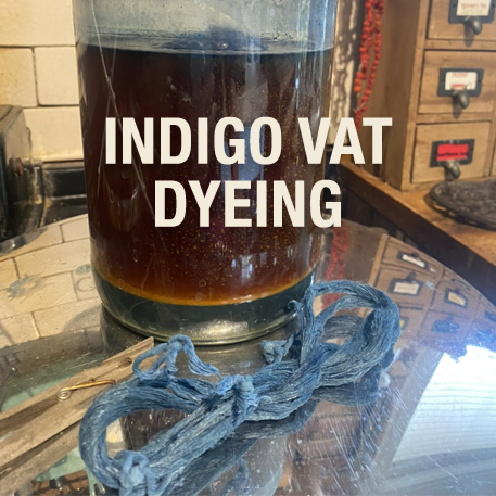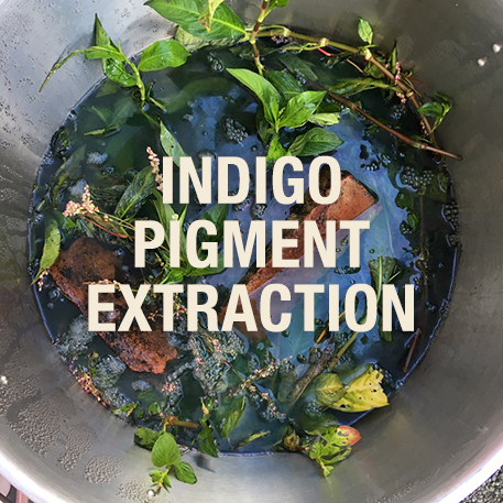 Indigo pigment extraction & vat dyeing taking you through the entire process from plant to coloured yarn, plus an opportunity to upcycle your old clothing in the community vat.